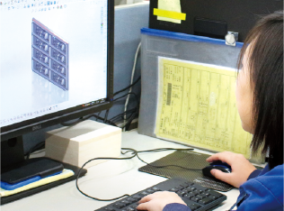 設計前のミーティングを重視。お客さまのニーズを把握したうえで「成形現場で役立つ金型」を構想します。トレイのデザインや素材の選択もフォロー。3D CADを駆使する設計段階では真空成形を知り尽くした経験を生かして、成形プロセスや素材の特性等のあらゆる要素を踏まえながら問題解決に基づく金型をデザインします。