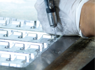 成形品の外観クオリティに深く関わる金型の研磨・仕上げ工程。ここでも長年積みあげたノウハウと先端のもの創り手法が融合。精度よくバキュームホールをあけるためドリルに独自のねじれ角度を設計して、オリジナルの研磨用機械に特製の刃物を組み合わせるなどで、ハイグレードな研磨・仕上げを常に追求しています。